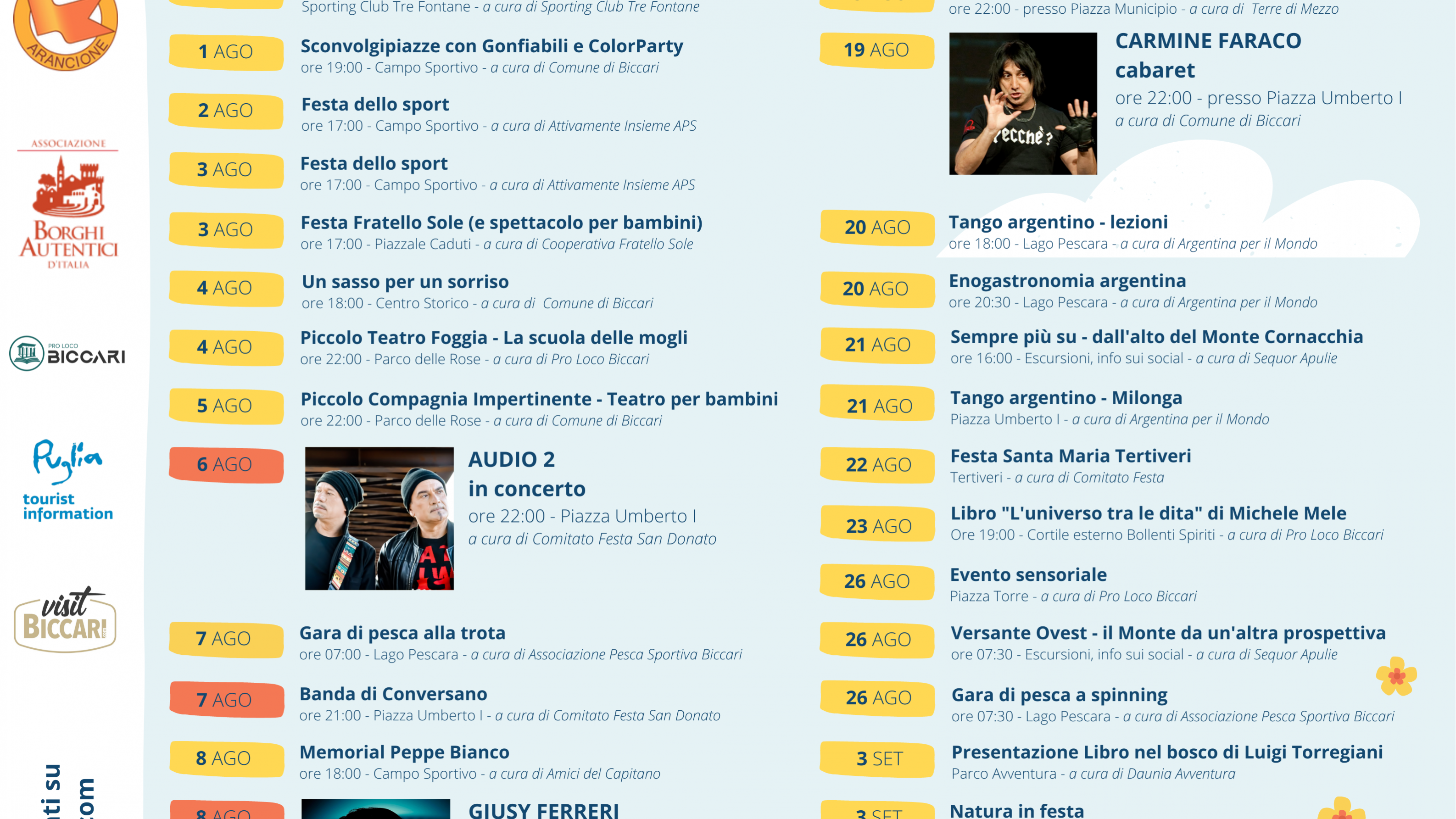Biccari – oltre 50 eventi da luglio ad ottobre tra borgo e montagna con concerti (Serena Brancale, Audio 2, Giusy Ferreri), rappresentazioni teatrali (Piccolo Teatro di Foggia, Piccola compagnia impertinente), cabaret (Uccio De Santis, Mudù, Carmine Faraco), momenti culturali, enogastronomia, integrazione e sociale, escursioni e visite guidate, esperienze, sport, appuntamenti dedicati ai bambini e, nonostante tutto, ancora lo spazio per qualche sorpresa fuori programma!
