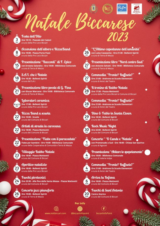 Ecco il programma completo del Natale Biccarese 2023, dal 3 dicembre al 20 Gennaio. Tanti appuntamenti per passare le feste insieme Tutti gli aggiornamenti ed i dettagli del programma saranno condivisi sugli account social Facebok e Instagram @BiccariInfoPoint. Buone feste! Scarica programma in JPGScarica programma in PDF