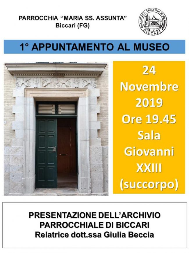 Domenica 24 Novembre, alle ore 19:45 presso la Sala Papa Giovanni XXIII, presentazione dell’Archivio Parrocchiale di Biccari con la dott.ssa Giulia Beccia. Per info: http://www.parrocchiabiccari.it/