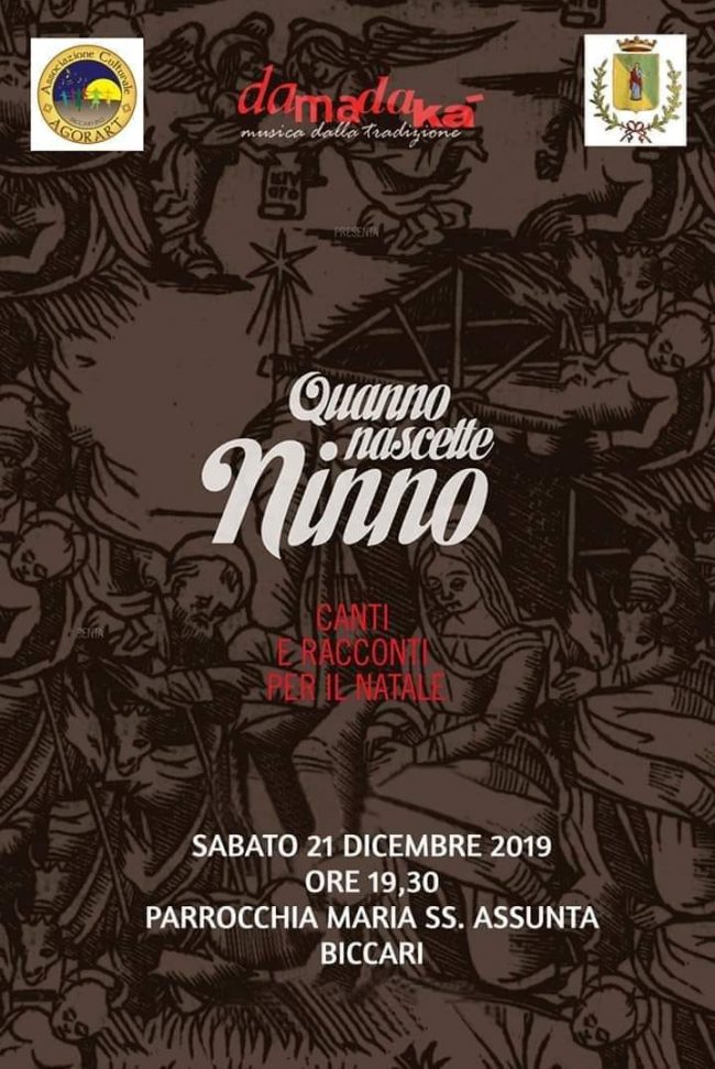 Sabato 21 Dicembre, alle 19:30, presso la Parrocchia Maria SS. Assunta di Biccari, concerto “Quanno nascette Ninno – canti e racconti per il Natale” dei Damadakà. Per info: Associazione Culturale Agorart