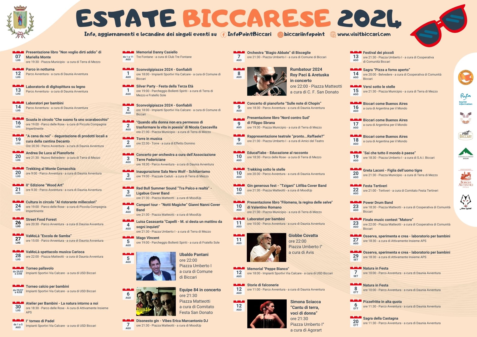 Sono più di 60 gli eventi programmati per l’Estate Biccarese 2024 che accompagneranno turisti e residenti da Luglio fino ad Ottobre. Qui di seguito tutti i dettagli e la possibilità di scaricarlo in formato JPG e PDF: Scarica programma in JPGScarica programma in PDF