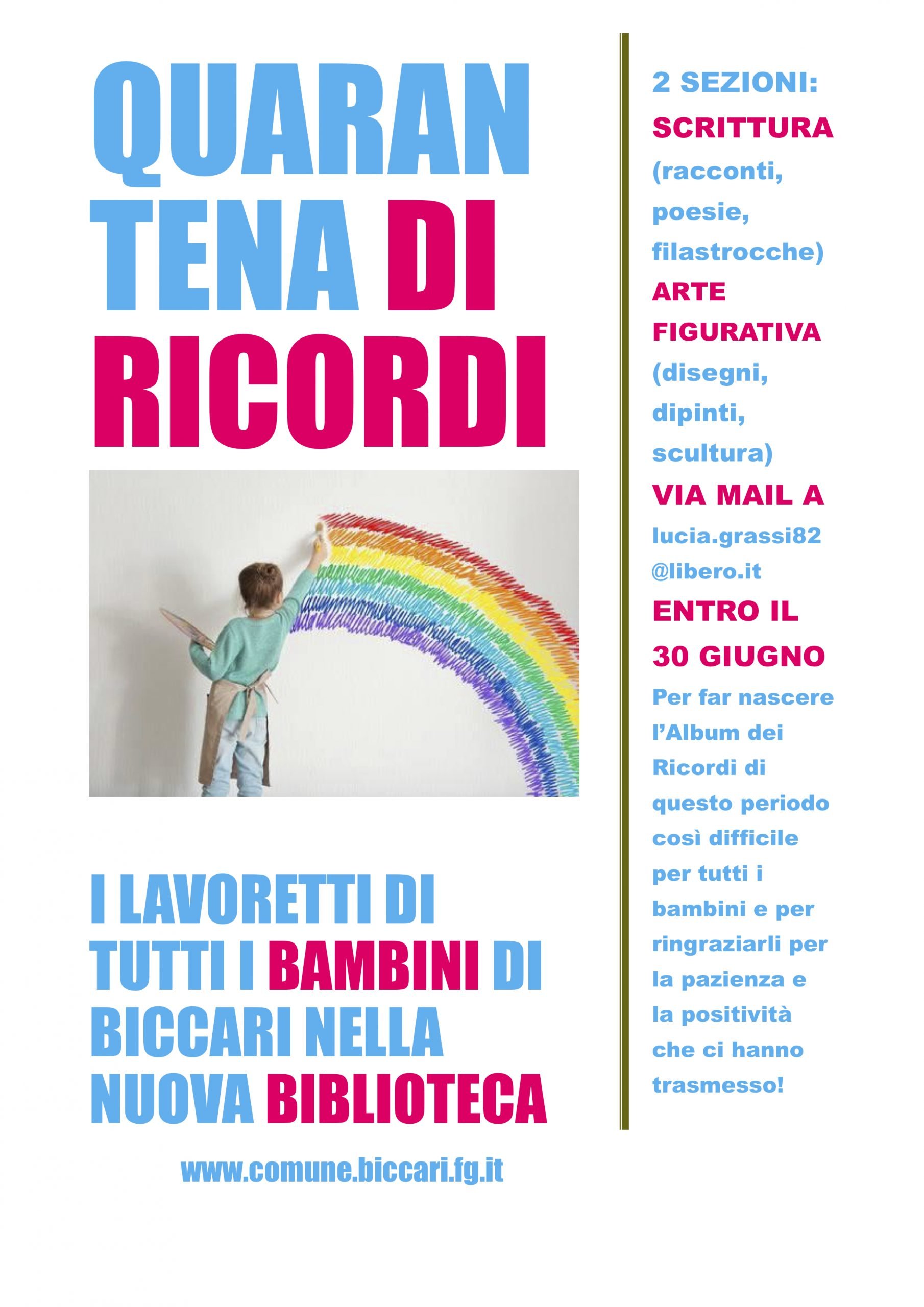 I lavoretti dei bambini di Biccari nella Nuova Biblioteca. 2 SEZIONI: SCRITTURA (racconti, poesie, filastrocche) ARTE FIGURATIVA (disegni, dipinti, scultura) E’ possibile inviare via mail i lavori a lucia.grassi82@libero.it, entro il 30 giugno, Per far nascere l’Album dei Ricordi di questo periodo così difficile per tutti i bambini: un modo per ringraziarli per la pazienza…