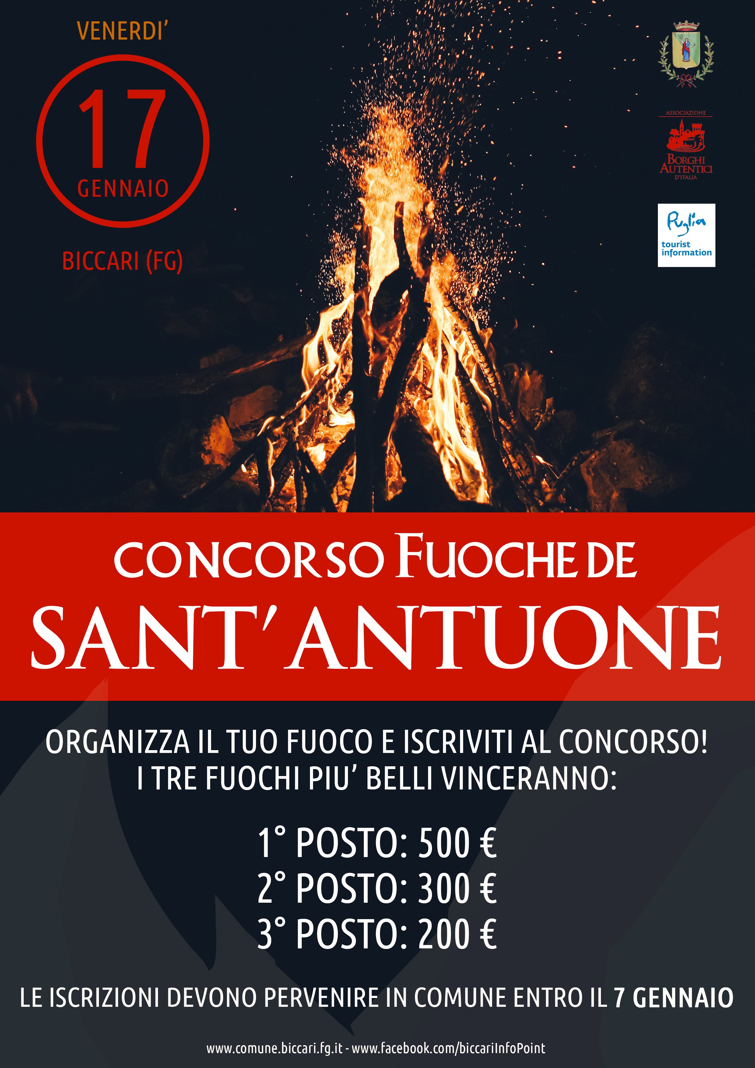 🔥🔥🔥 Fuoche di Sant’Antuone 🔥🔥🔥 Quest’anno torna il concorso che premia il falò più bello! Chi vuole cimentarsi nella realizzazione dei tradizionali falò può iscriversi al concorso entro il 7 gennaio (con domanda alla Polizia Municipale). Premi in denaro per i primi tre falò (500, 300 e 200 euro).