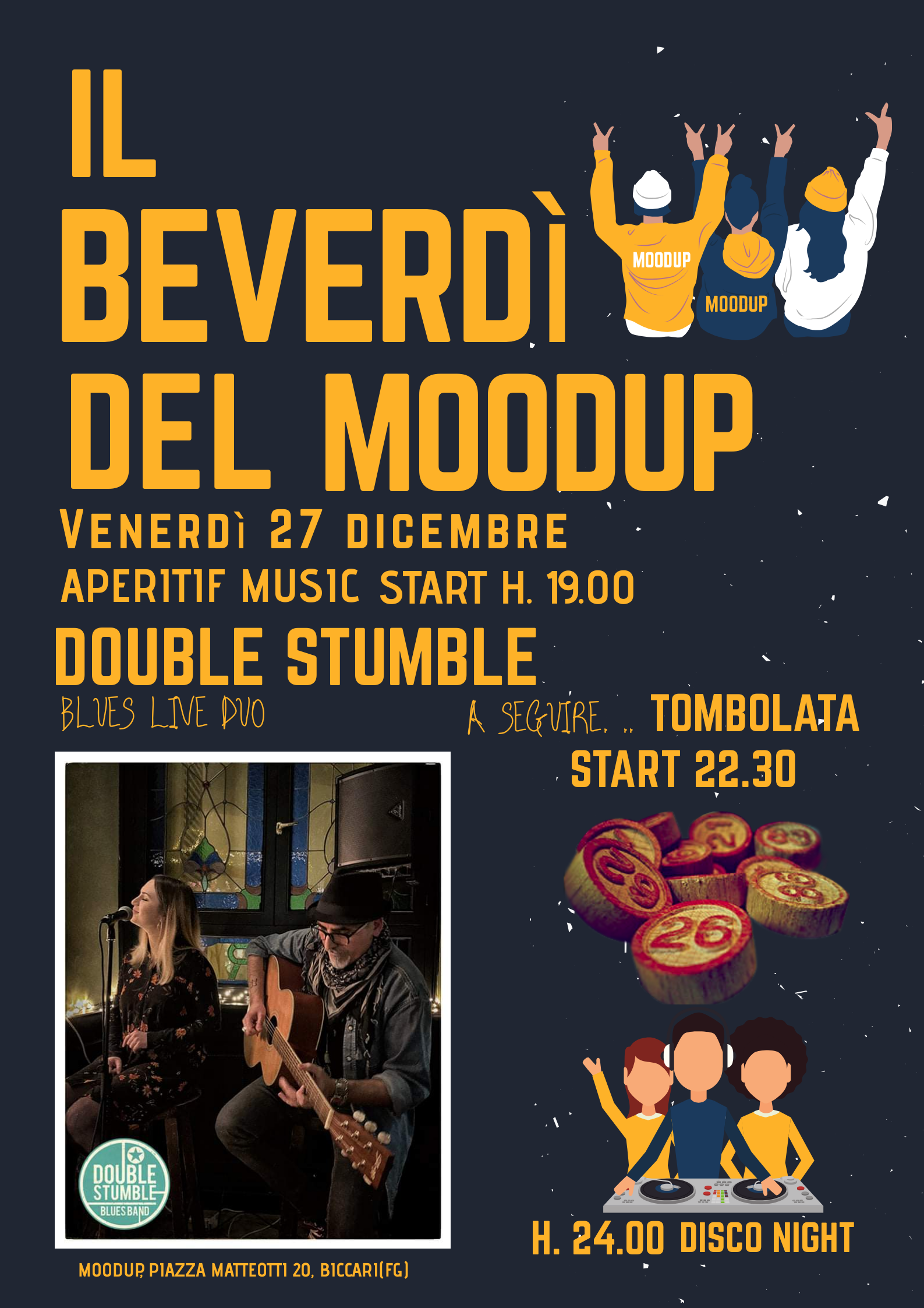 Ecco il programma di “Beverdì”, evento di MoodUp per Venerdì 27 Dicembre: Ore 19:00 Aperitivo in compagnia dei Double Stumble Blues Live Duo, due ore di musica dal vivo accompagnati dal blues in un atmosfera perfetta per l’aperitivo. A seguire Tombolata 2.0 su schermo Tv Chiusura A finire Disco Night con i più grandi successi…