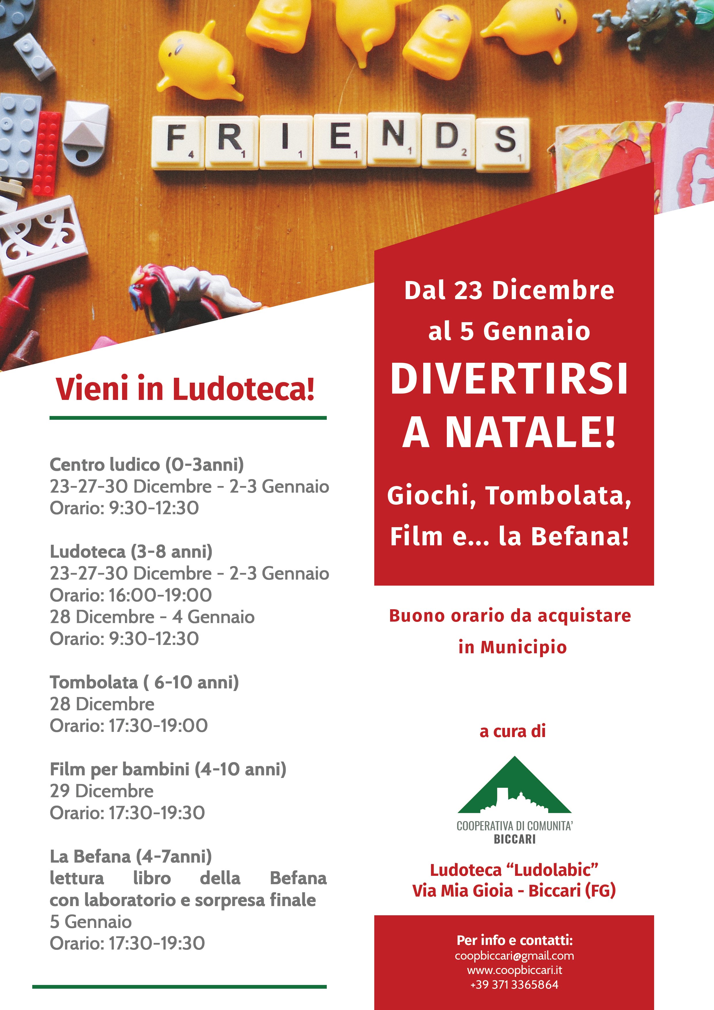 Da Lunedì 23 Dicembre a Domenica 5 Gennaio ecco gli appuntamenti alla Ludoteca Comunale: Centro ludico (0-3anni) 23-27-30 Dicembre – 2-3 Gennaio Orario: 9:30-12:30 Ludoteca (3-8 anni) 23-27-30 Dicembre – 2-3 Gennaio Orario: 16:00-19:00 28 Dicembre – 4 Gennaio Orario: 9:30-12:30 Tombolata ( 6-10 anni) 28 Dicembre Orario: 17:30-19:00 Film per bambini (4-10 anni)…
