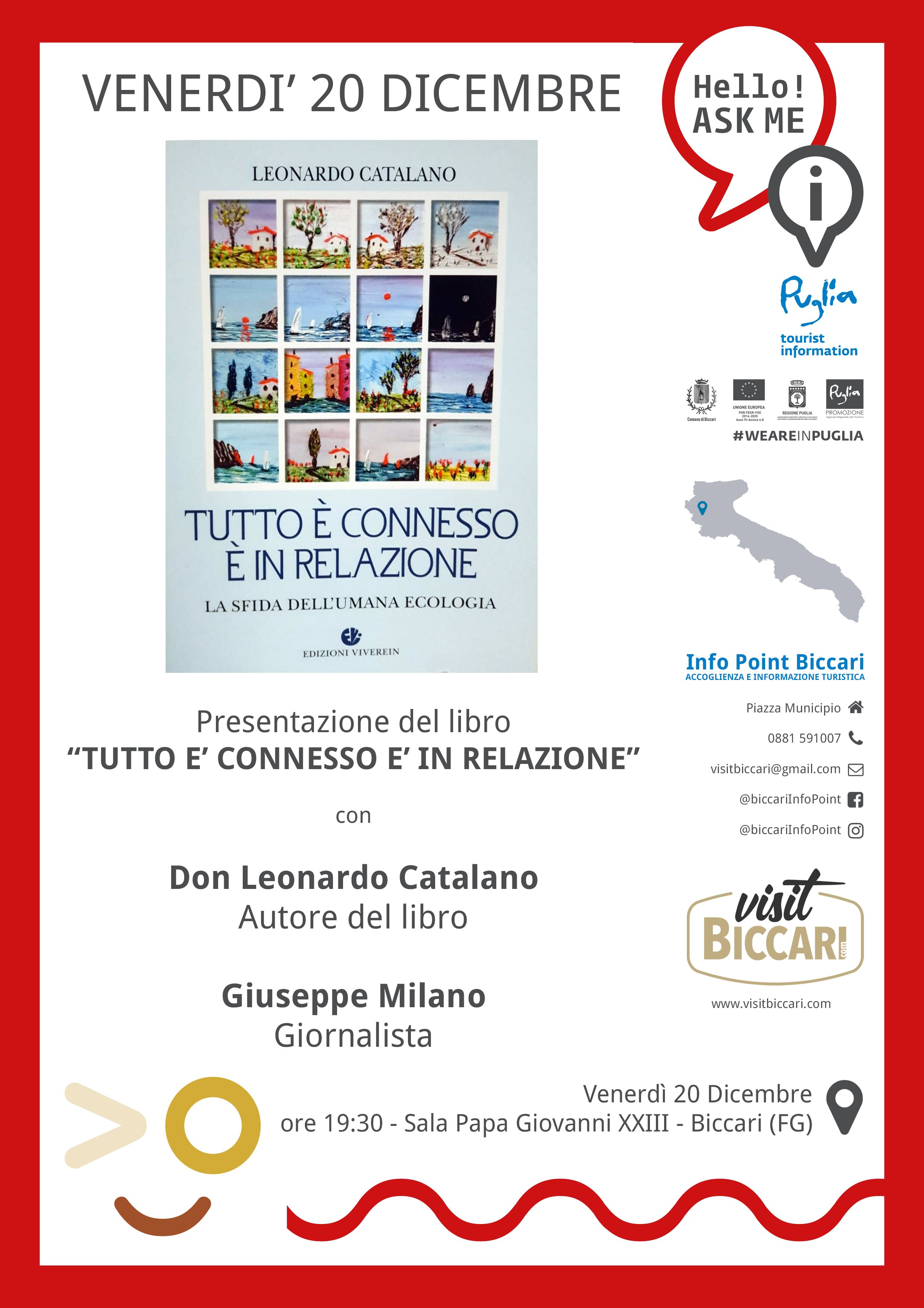 Venerdì 20 Dicembre, presso la Sala Papa Giovanni XXIII alle ore 19:30, presentazione del libro “Tutto è connesso è in relazione”. Interverranno Don Leonardo Catalano, autore del libro, e Giuseppe Milano, giornalista ed urbanista. Per info: Parrocchia Biccari