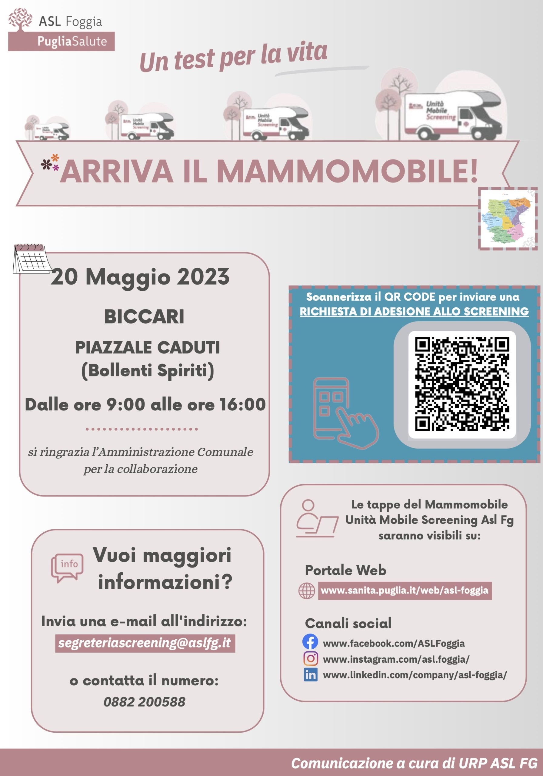 20 Maggio 2023 – Un test per la vita ARRIVA IL MAMMOMOBILE! L’appuntamento è presso il Piazzale dei Caduti / Bollenti Spiriti, dalle ore 9:00 alle ore 16:00. ✉️ Per ulteriori dettagli: segreteriascreening@aslfg.it Di seguito tutte le info: