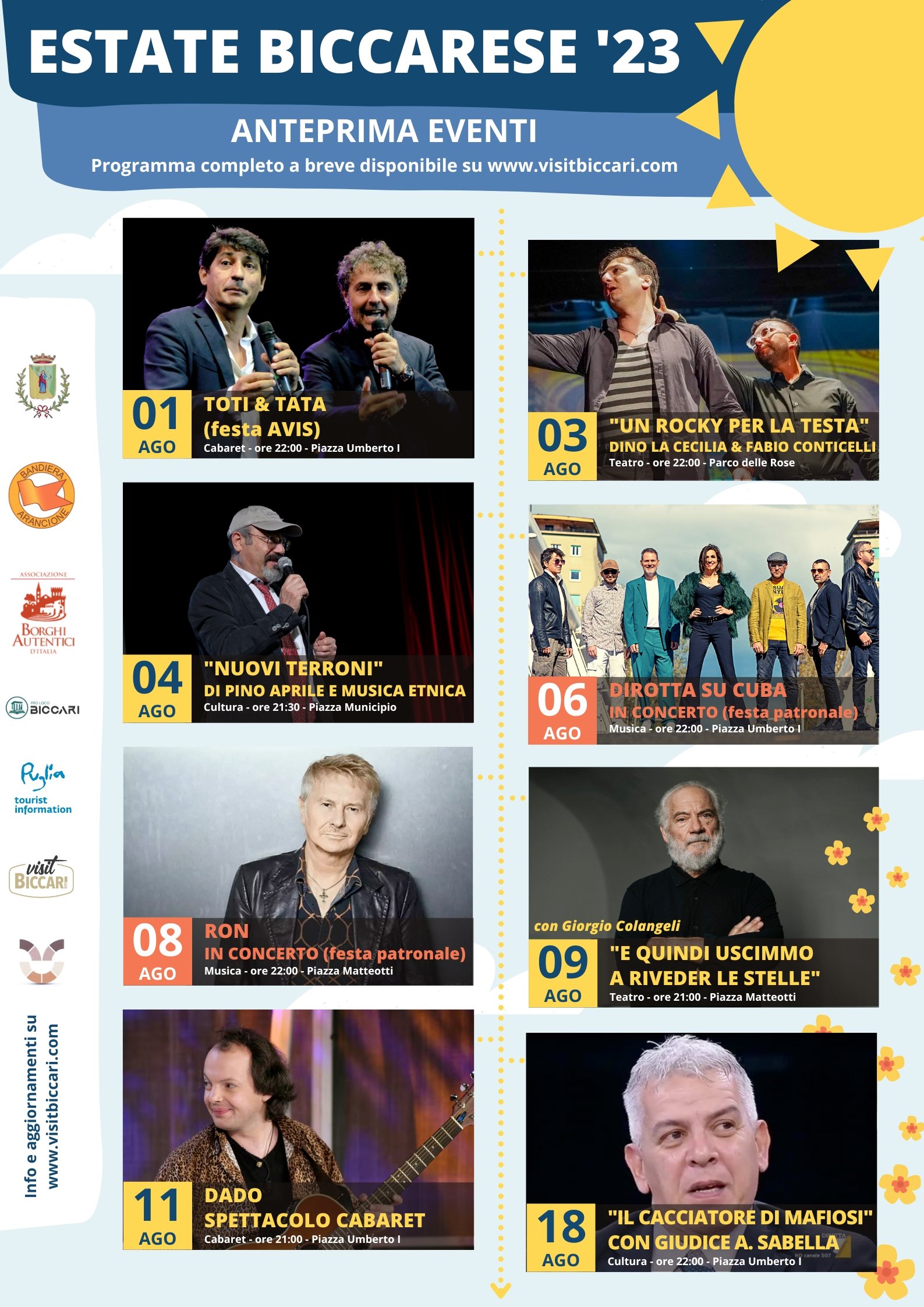 In attesa del programma completo con oltre 𝟱𝟬 eventi fino ad 𝗼𝘁𝘁𝗼𝗯𝗿𝗲 (a breve su www.visitbiccari.com e InfoPoint Biccari – visitbiccari.com) ecco una prima anticipazione all’insegna della grande musica, cabaret, teatro e cultura!