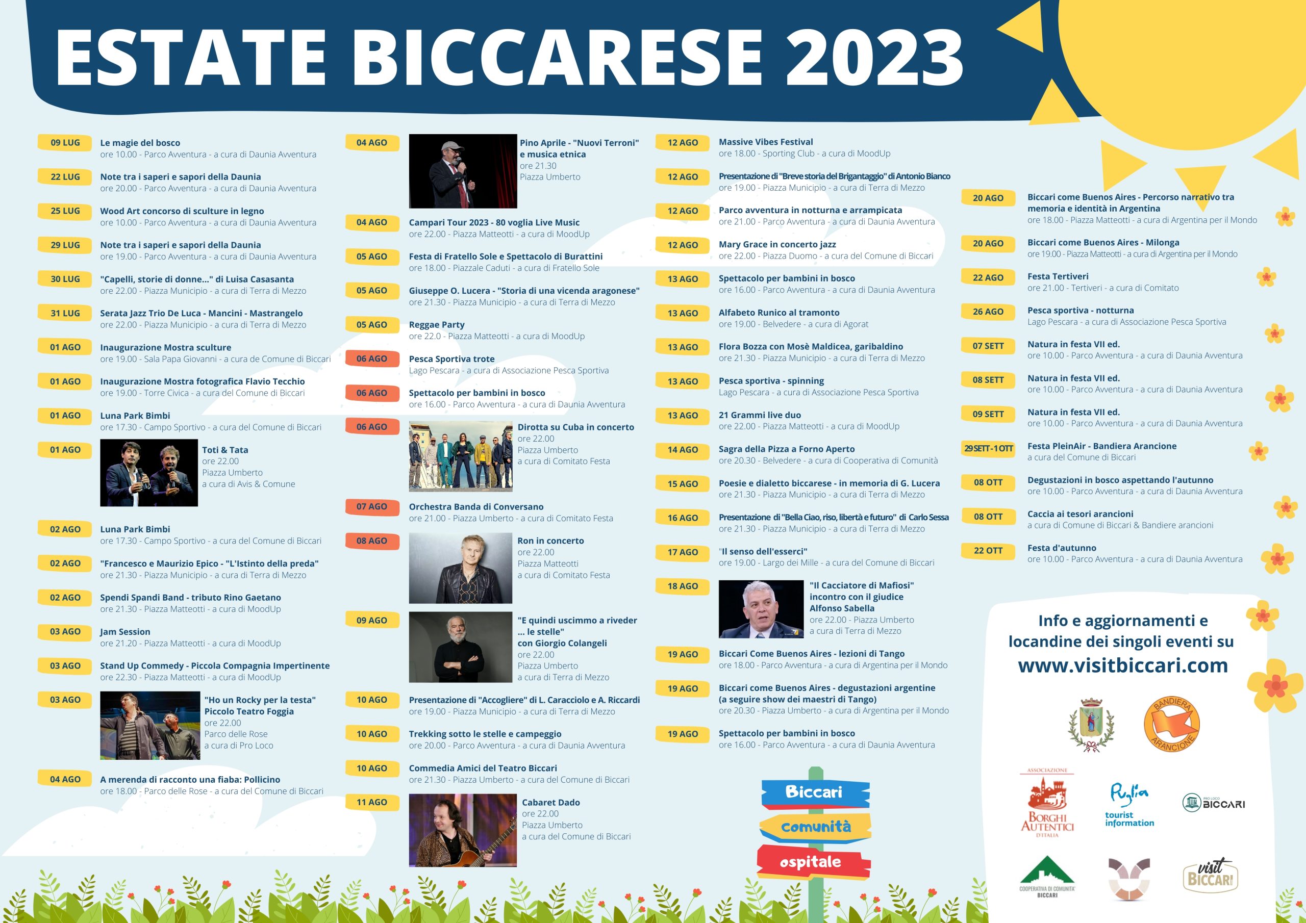 Sono più di 50 gli eventi programmati per l’Estate Biccarese 2023 che accompagneranno turisti e residenti da Luglio fino ad Ottobre. Qui di seguito tutti i dettagli e la possibilità di scaricarlo in formato JPG e PDF: Scarica programma in JPGScarica programma in PDF 09 lug Le magie del bosco ore 10.00 – Parco Avventura…