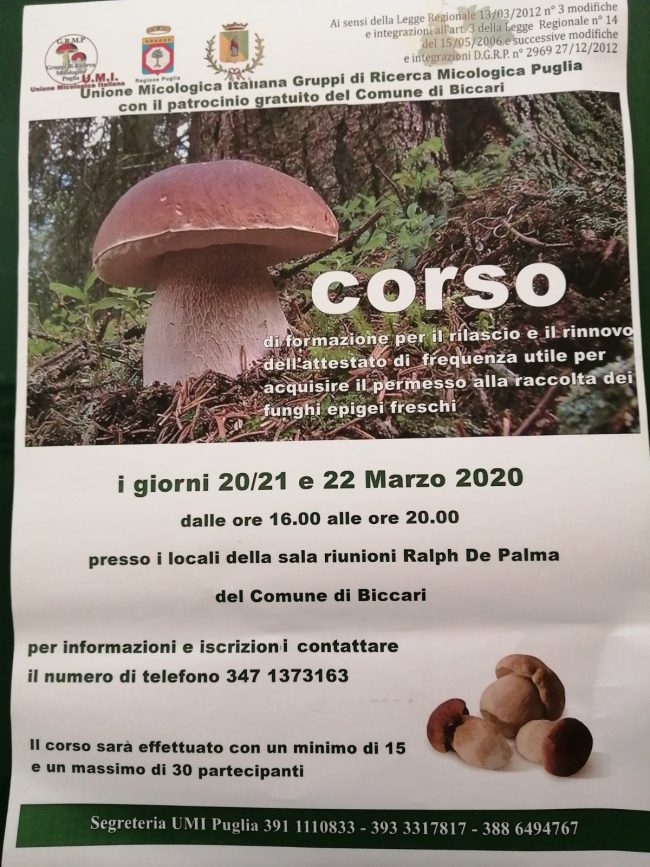 Il 20 e 21 marzo, dalle ore 16.00 alle ore 20.00, presso il Comune di Biccari è in programma il corso di formazione per il rilascio e l’attestato di frequenza utile per acquisire il permesso alla raccolta dei funghi epigei freschi a cura dell’Unione Micologica Italiana – Gruppi di Ricerca Micologica Puglia. Il corso sarà…