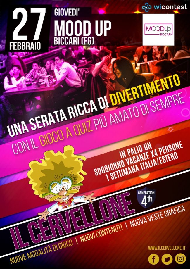 La sfida è quella di farvi uscire ogni giovedì sera! Dopo anni torna a Biccari il Cervellone, il gioco a Quiz più amato di sempre! E dove se non al MoodUp! Si comincia Giovedì 27 Febbraio con la prima data da non perdere assolutamente per poter ambire al soggiorno di una settimana x 4 persone…