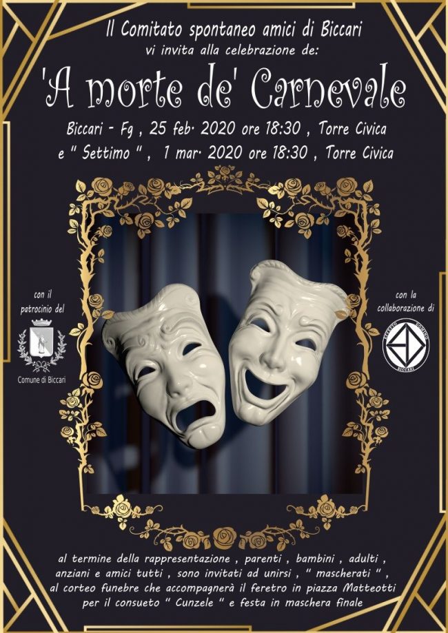 Grazie alla collaborazione tra Effetto Domino e il Comitato spontaneo Amici di Biccari, torna la tradizionale rappresentazione de “A morte de Carnevale”. Ecco gli appuntamenti: Martedì 25 Febbraio, ore 18:30, presso la Torre Civica “Settimo”, Domenica 1 Marzo, ore 18:30, presso la Torre Civica Al termine della rappresentazione parenti, bambini, adulti, aziani e amici tutti…